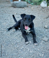 Cute black Patterdale Terrier dog lying on the asphalt ground