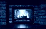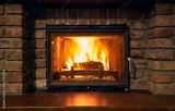 fireplace and fire close view as object or background, brick wall