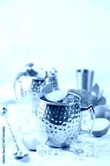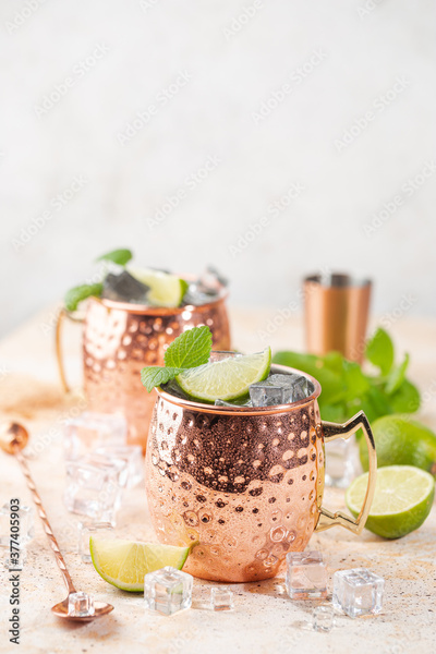 Cold Moscow Mules cocktail with ginger beer, vodka, lime. White stone background.