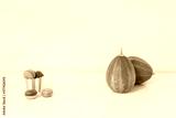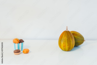 Minimalist Halloween concept - sweets, macarons dessert in a paper cup, and decorative pumpkins. Chocolate and pumpkin macaroons on a white background. Thanksgiving menu. Copy Space.