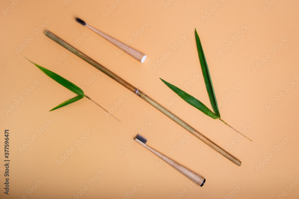 Top view fresh bamboo leaves and canes with toothbrushes made using waste-free technologies on beige background. Concept of rational and conscious use of natural resources, environmental protection.
