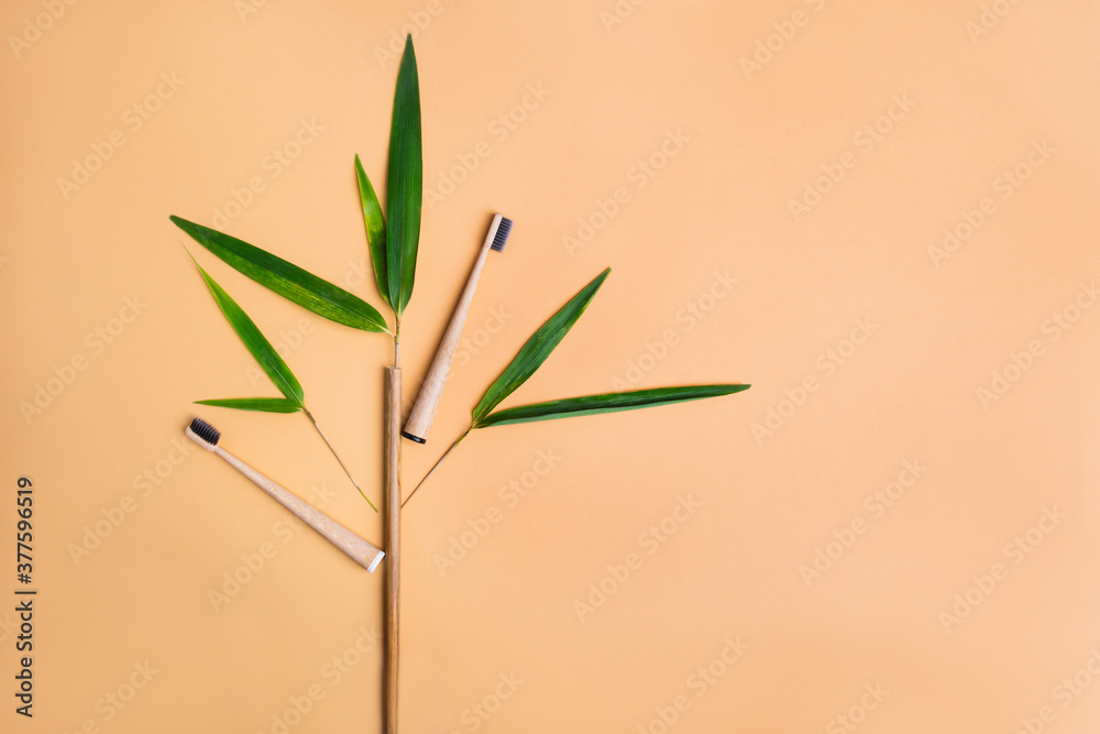 Top view fresh bamboo cane with green leaves and toothbrushes in form of bamboo plant on beige background. Concept of rational, conscious use of natural resources, environmental protection. zero waste