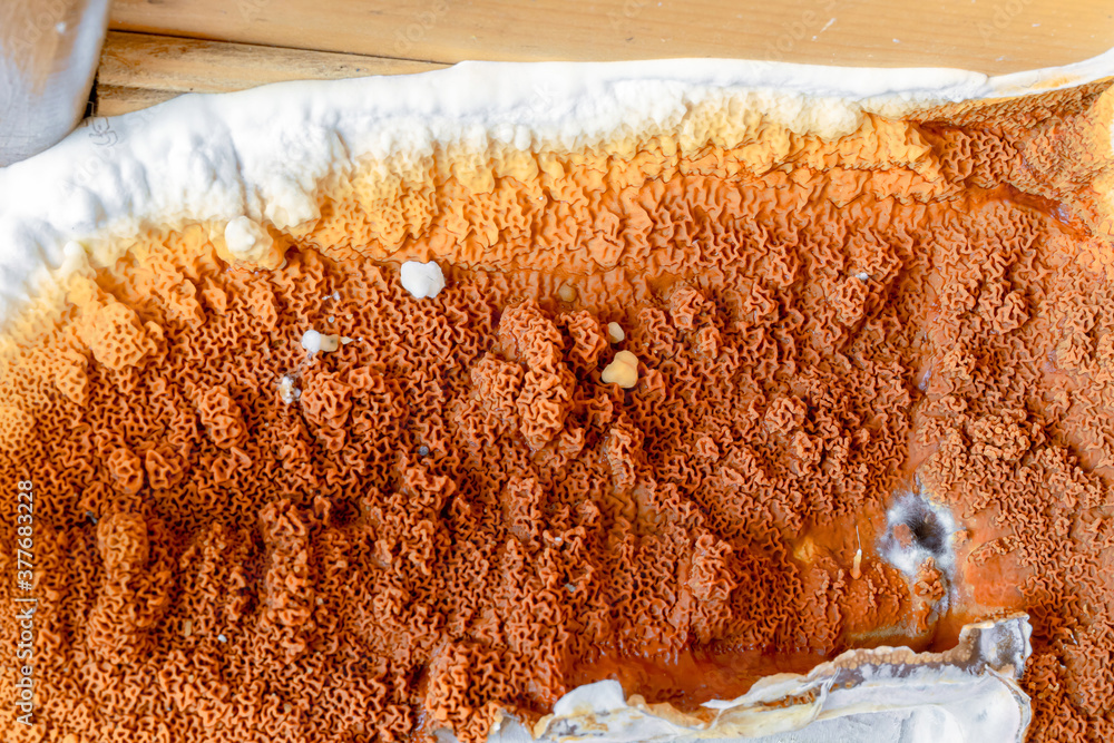 A large growing fungus Serpula lacrymans on the walls and floor of a residential building. It is the most destructive fungus attacking wooden elements in structures