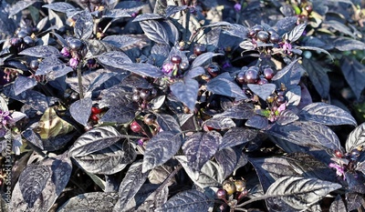 Black Pearl chili pepper, cultivar of Caspicum anunum. It is edible, but it's also considerated an ornamental plant.
