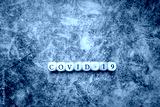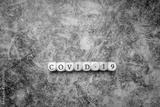 Wooden dices with the words "Covid - 19" on dark background, coronavirus and Medical concept