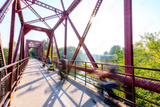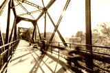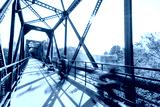 Motion blur bikers cross a bridge over the Boise River