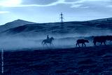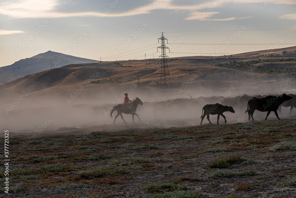 Herd of cattle and buffalo walking on dusty roads. green background and mountain