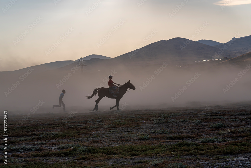 Herd of cattle and buffalo walking on dusty roads. green background and mountain
