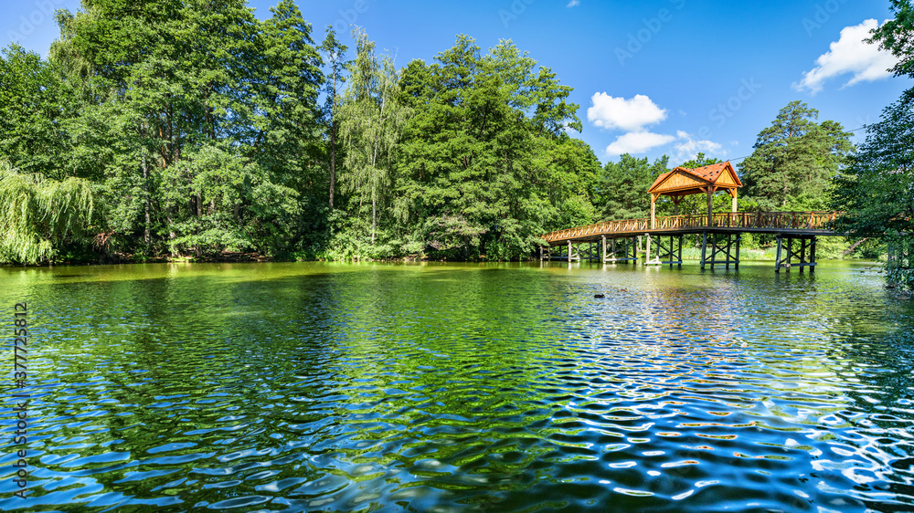 Wooden bridge over the lake in the village of Pushcha-Voditsa, Kiev region, Ukraine. Landscape with trees reflecting, in the water, beautiful summer photography, background