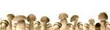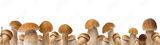 Close up of many different Boletus edulis (king bolete) / penny bun / cep / porcini / mushroom isolated on white background banner wide panoramic panorama