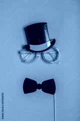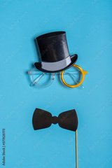 Black photo booth props: cylinder hat, glasses and bow tie on blue background. Greeting card for father's day. Creative composition in minimal style, flat lay, top view