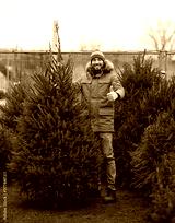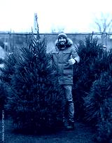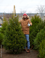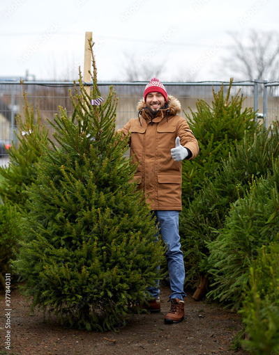 winter holidays, sale and people concept - happy smiling man choosing or selling christmas tree and showing thumbs up at street market