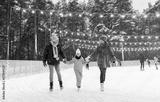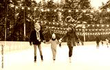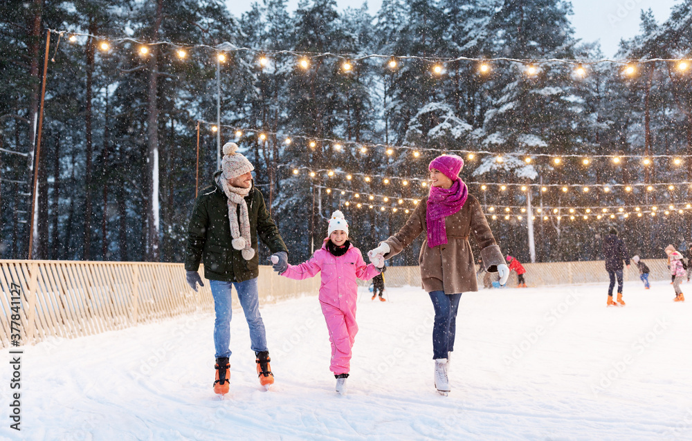 christmas, family and leisure concept - happy mother, father and daughter at outdoor skating rink in winter