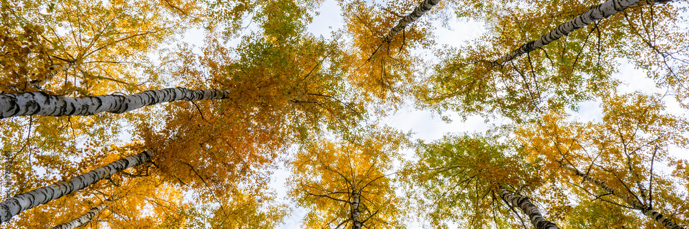 Picturesque autumn landscape with view of birch trees tops with yellow foliage against sky in cloudy autumn day. Beautiful natural background, wonderful nature, seasons changing concept