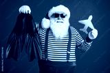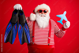 Photo of grandfather grey beard hold paper plane diving gear flippers wear santa claus x-mas costume suspenders sunglass striped shirt cap isolated red color background