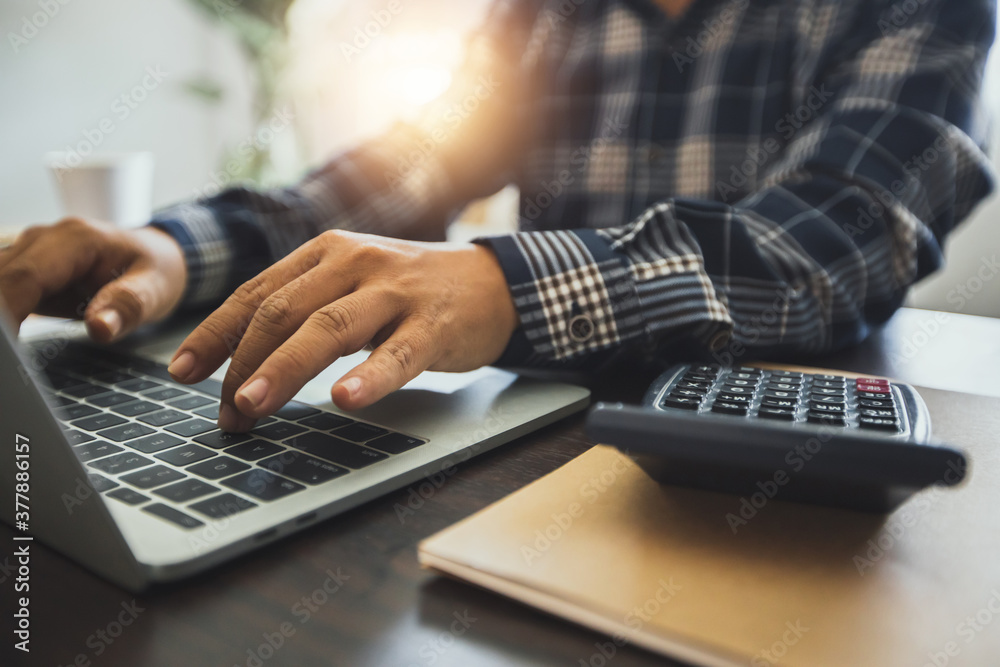 Close up hand of businessman use record number and financial budget on laptop after calculate with calculator, finance and accountant with technology concept.