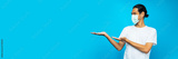 Portrait of Asian man wearing face mask show hand for put and present product on blue background