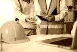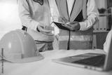 close up helmet of engineer explaining project work on laptop and discussing about drawing blueprint as partner writing data on paper, architect meeting, brainstorming of designer and teamwork concept