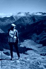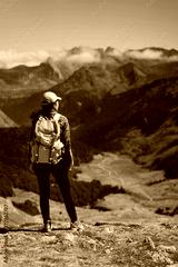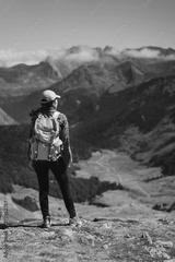 Female Hiker looking breathtaking alpine landscapes in summer time. Connection with Nature and Solo Traveling