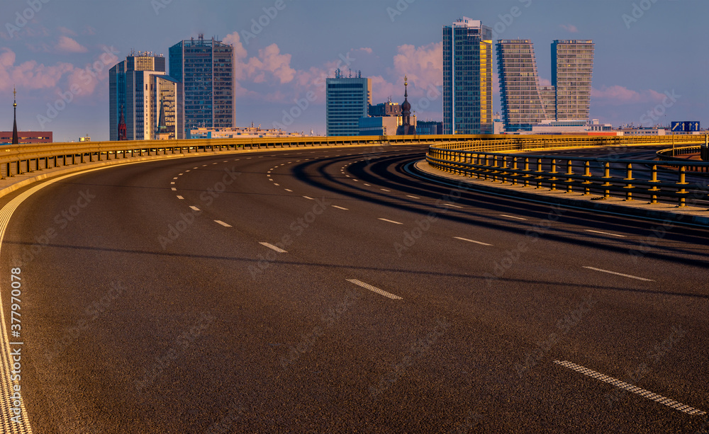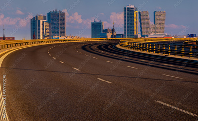express road leading through the city during sunrise, perfect as a backplate for rendering e.g. cars