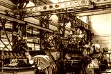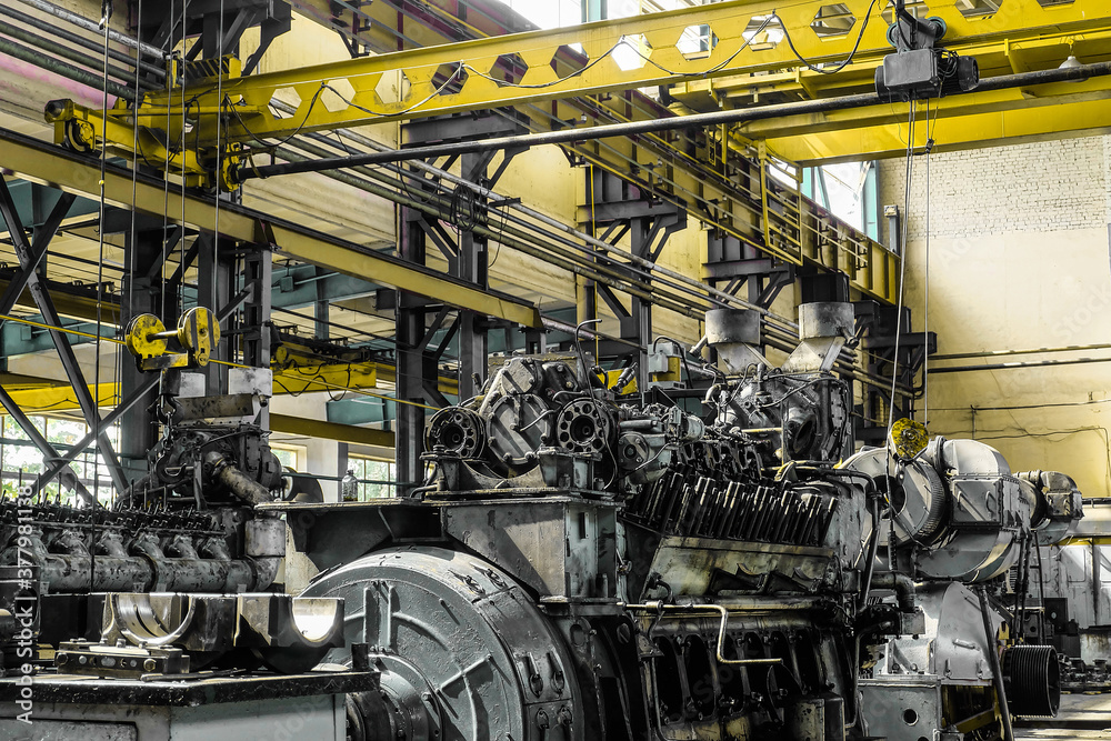 Diesel locomotive engine in a repair workshop with overhead crane