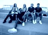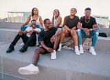 Group of young modern african black friends happily sitting together on the bench of the stairs in bright sunlight enjoying summer vacation