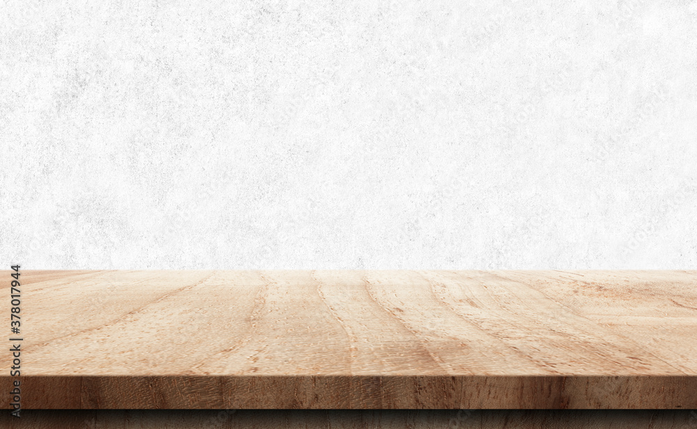 wood table top and white wall background in kitchen, wooden shelf desk surface, counter for food and product display