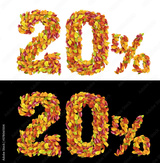 50%, 20%, Letter from autumn colorful leaves, Sale letter 3D rendering made by leaves autumn.
