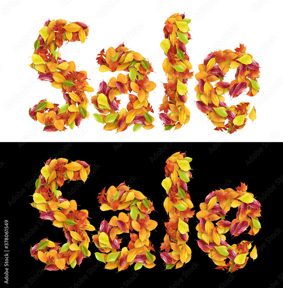 50%, 20%, Letter from autumn colorful leaves, Sale letter 3D rendering made by leaves autumn.