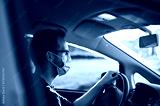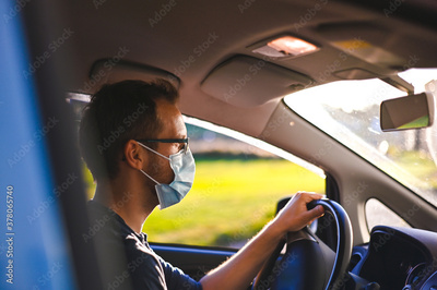 portrait of attractive nerd in long sleeve glasses and protective face mask in electric car at sunset