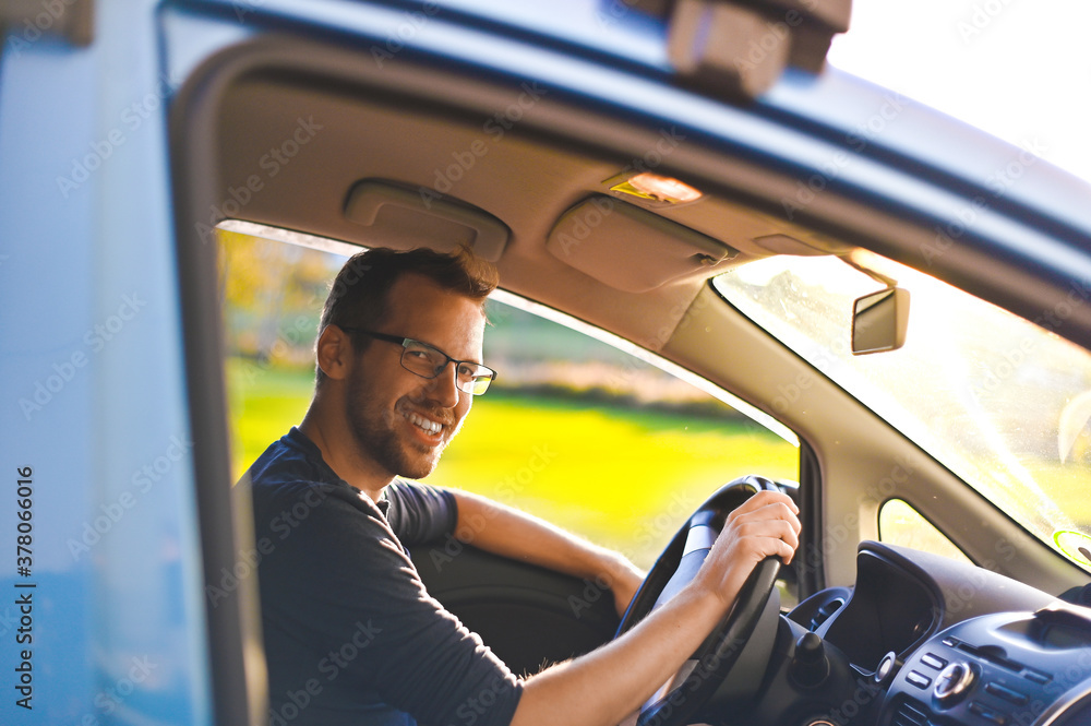 portrait of attractive nerd in long sleeve glasses and beard in the electric car at sunset