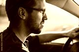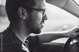 portrait of attractive nerd in long sleeve glasses and beard in the electric car at sunset