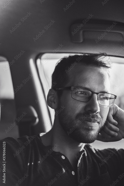 portrait of attractive nerd in long sleeve glasses and beard in the electric car at sunset