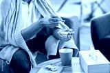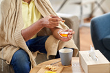 health, cold and people concept - sick man in blanket preparing hot tea with lemon, honey and ginger at home