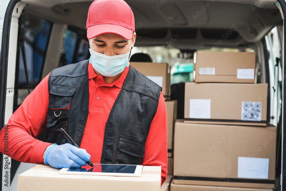 Delivery man writing receipt during coronavirus pandemic time - Covid-19 work measures and social distance concept - Focus on man face
