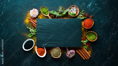 Colorful herbs and spices for cooking. Indian spices. On a black stone background. Top view.