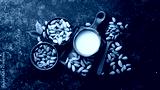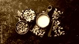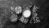 Almond milk and almonds on black stone background. Top view. Free space for your text.