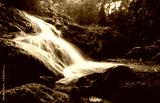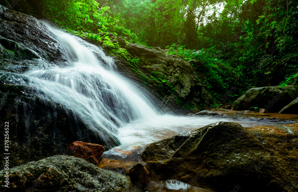 Beautiful waterfall in jungle. Waterfall in tropical forest with green tree and sunlight. Waterfall is flowing in jungle. Nature background. Rock or stone at waterfall. Long exposure photography.