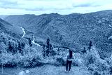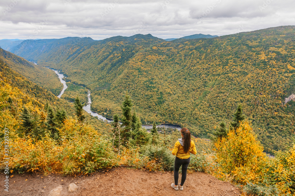 Canada fall season travel autumn destination. Woman tourist alone, sightseeing looking at landscape of Jacques Cartier National Park river in Quebec.