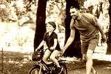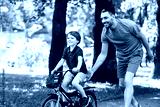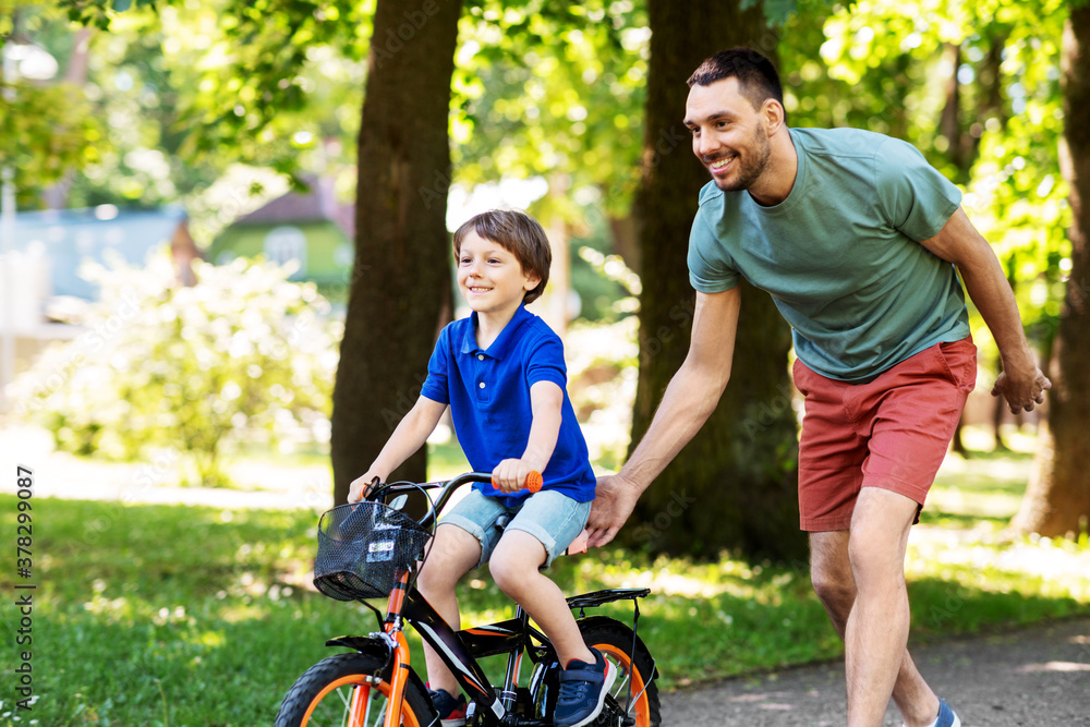 family, fatherhood and leisure concept - happy father teaching little son to ride bicycle at park