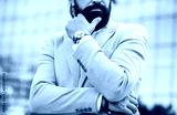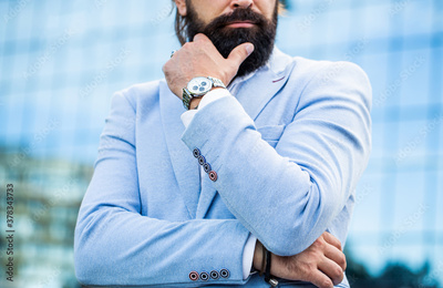 Watch in a man. Businessman points to his watch on the background of the town. The man holds his watch. Portrait successful businessman in a business suit, using the watch on a city background