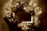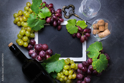 Wine tasting and degustation concept. Grape vine, bottle, glasses, corkscrew