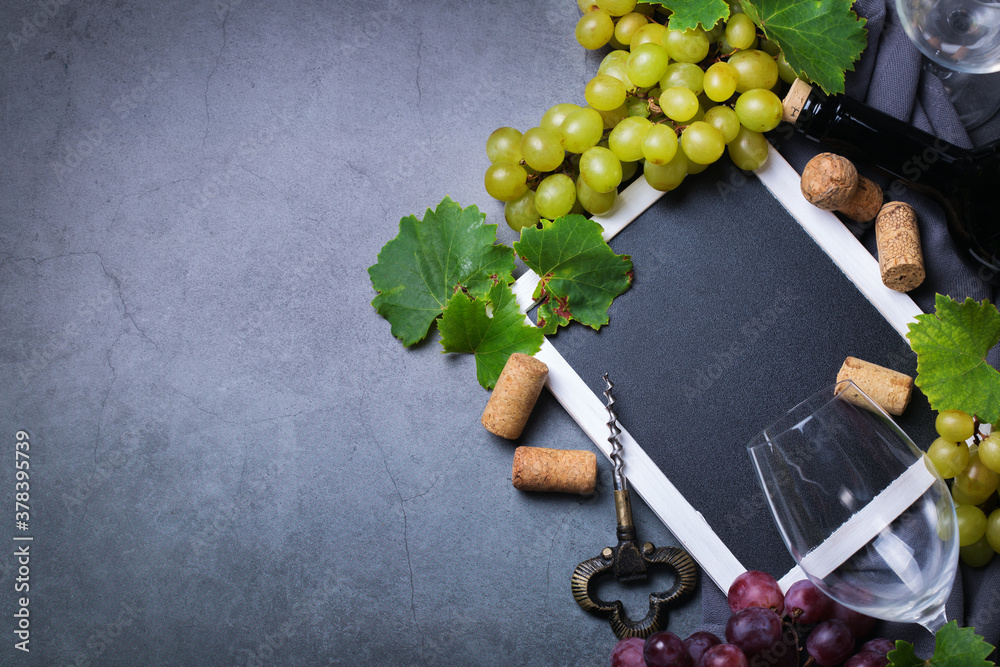 Wine tasting and degustation concept. Grape vine, bottle, glasses, corkscrew