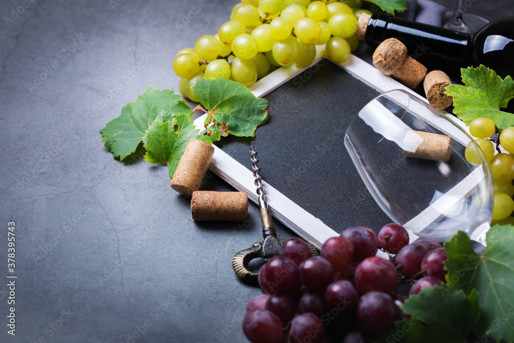 Wine tasting and degustation concept. Grape vine, bottle, glasses, corkscrew