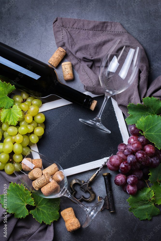 Wine tasting and degustation concept. Grape vine, bottle, glasses, corkscrew