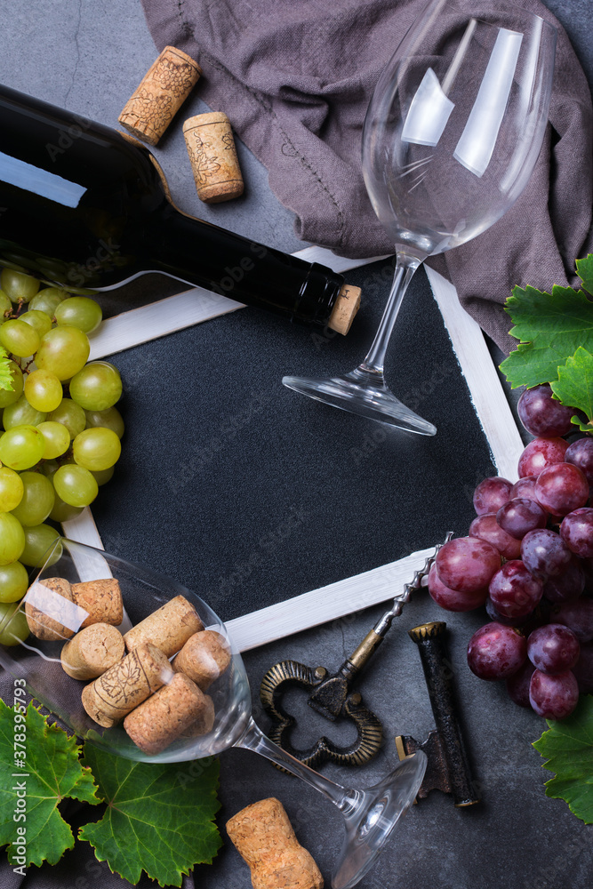 Wine tasting and degustation concept. Grape vine, bottle, glasses, corkscrew
