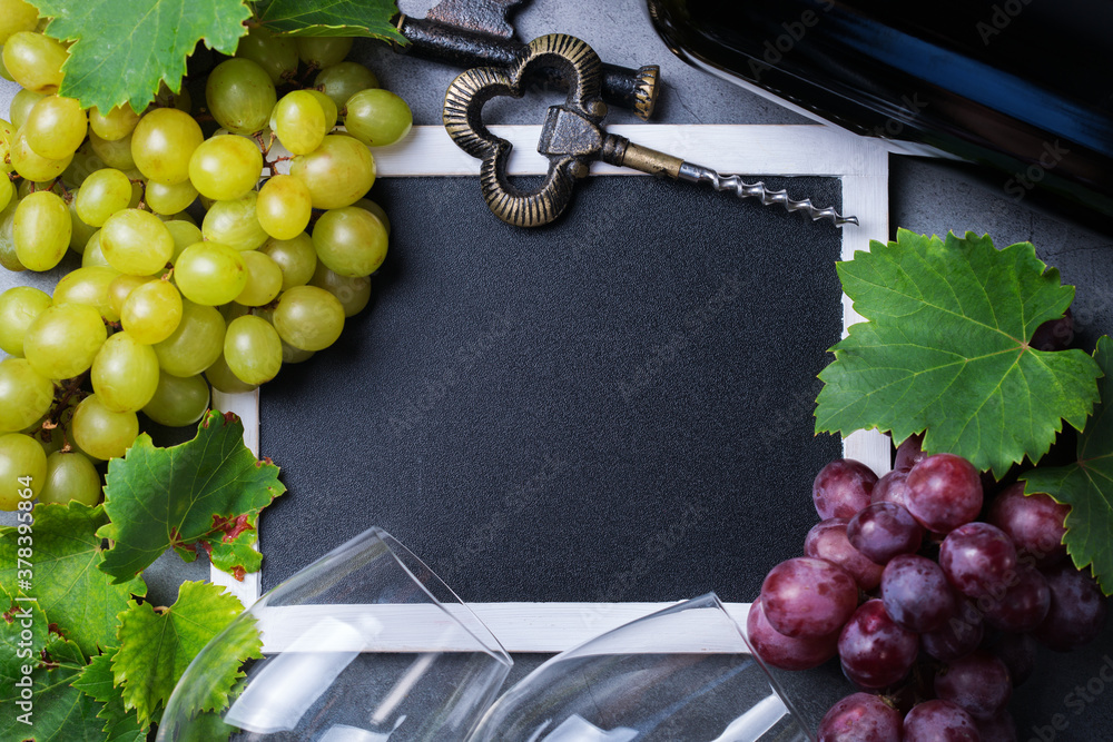 Wine tasting and degustation concept. Grape vine, bottle, glasses, corkscrew
