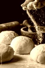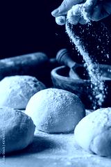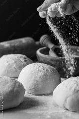 Preparing yeast dough for bread on wooden background.