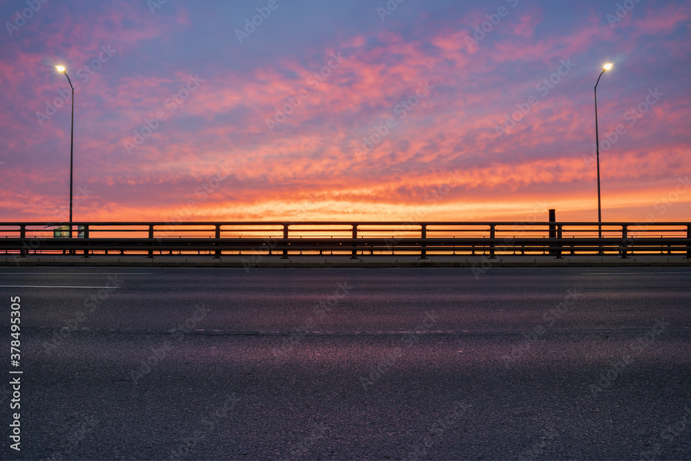 express road leading through the city during sunrise, perfect as a backplate for rendering e.g. cars
