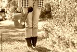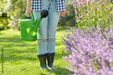 gardening and people concept - young woman with watering can pouring water to flowers at garden